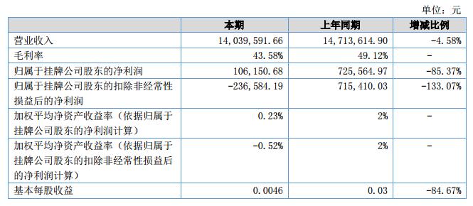 報告期內(nèi),公司實現(xiàn)營業(yè)收入1,403.96萬元,比上年同期減少4.58%;公司實現(xiàn)凈利潤10.62萬元,比上年同期下降85.37%。?
