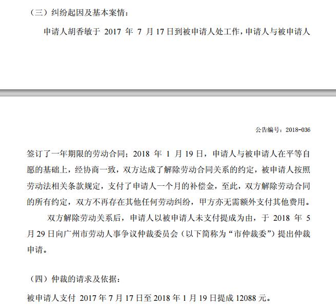 據(jù)介紹, 2017 年 7 月 17 日,胡香敏加入公司,并與公司簽訂了一年期限的勞動合同。2018 年 1 月 19 日,胡香敏與被公司實控人黃志紅在平等自愿的基礎上,經(jīng)協(xié)商一致,雙方達成了解除勞動合同關系的約定,被公司按照勞動法相關條款規(guī)定,支付了申請人一個月的補償金,雙方解除勞動合同的所有約定,雙方不再存在其他任何勞動糾紛,甲方亦無需額外支付其他費用。