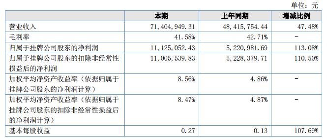 報告期內(nèi),公司實現(xiàn)營業(yè)收入71,404,949.31元,較上年同期營業(yè)收入48,415,754.44元,同比增長47.48%,主要原因是公司所處行業(yè)顯著復蘇,工程機械行業(yè)更新?lián)Q代和新增需求,“一帶一路”基建需求刺激,以及國內(nèi)基礎(chǔ)設(shè)施投資建設(shè)剛需所致;報告期內(nèi)實現(xiàn)利潤總額13,095,099.29元,實現(xiàn)凈利潤11,012,334.84元,產(chǎn)品銷售毛利率為41.58%,較上年同期毛利率42.71%,降低1.13%,毛利下降的原因主要是因為材料成本增加。?