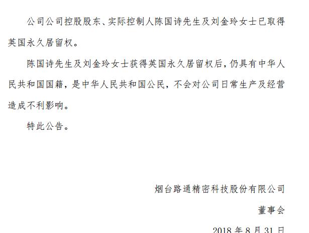 據(jù)介紹,路通精密控股股東、實(shí)際控制人陳國(guó)詩(shī)及劉金玲已取得英國(guó)永久居留權(quán)。