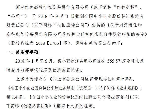 挖貝網 9月4日消息,新三板掛牌企業(yè)佳和高科(838149)董事長孟小聚違規(guī)占用資金555.57 萬元,未及時履行內部審議程序和信息披露,被全國股轉公司出具警示函。