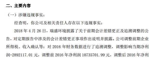 據(jù)全國股轉(zhuǎn)公司披露,經(jīng)查明,2018年4月26日瑞盛環(huán)境披露了關(guān)于前期會計(jì)差錯(cuò)更正及追溯調(diào)整的公告,將2015-2016年的利潤各調(diào)低了150萬和289萬,并調(diào)整前期企業(yè)所得稅、收入確認(rèn)等。