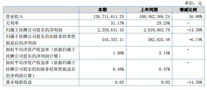 公司在報告期內的主營業(yè)務收入為12,671.16萬元,比上年同期增長16.80%;營業(yè)成本為8,721.72萬元,比上年同期增長13.63%;2018年上半年毛利率31.17%,較去年同期上升1.92%;歸屬于母公司的凈利潤為225.96萬元,比上年同期下降14.38%。?