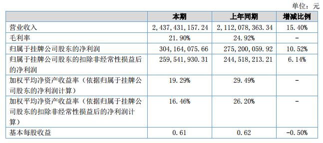 公司報告期內(nèi)實現(xiàn)營業(yè)收入2,437,431,157.24元,比去年同期收入2,112,078,363.34元,增長15.40%;凈利潤分別為304,164,075.66元,比去年同期的275,200,059.92元增長10.52%。報告期末,公司總資產(chǎn)為5,707,224,058.06元,凈資產(chǎn)為1,729,268,256.21元。?