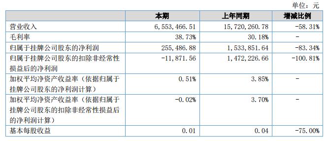 截止2018年6月30日,公司實(shí)現(xiàn)營(yíng)業(yè)收入6,553,466.51元,較上年同期下降58.31%,歸屬于掛牌公司股東的凈利潤(rùn)255,486.88元,較上年同期下降93.34%,歸屬于掛牌公司股東的扣除非經(jīng)常性損益后的凈利潤(rùn)-11,871.56,較上年同期下降99.19%,。