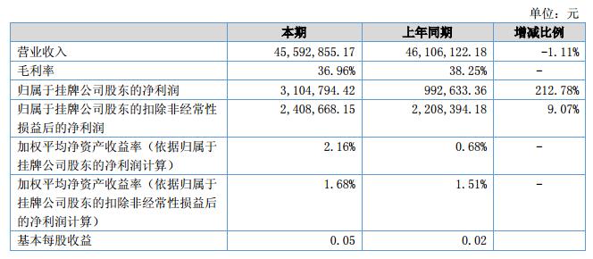 報(bào)告期內(nèi)營(yíng)業(yè)收入4,559萬(wàn)元,比上年同期下降1.11%;營(yíng)業(yè)成本2,874萬(wàn)元,比上年同期上升0.95%;凈利潤(rùn)為310萬(wàn)元,比上年同期增長(zhǎng)559.43%;凈資產(chǎn)收益率為2.16%,同比上升1.48個(gè)百分點(diǎn)。?
