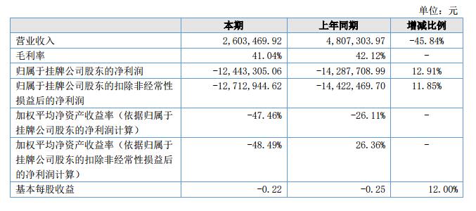 報(bào)告期內(nèi)營(yíng)業(yè)收入2,603,469.92元,較上年同期減少45.84%;營(yíng)業(yè)成本1,534,876.07元,較上年同期減少44.83%;利潤(rùn)總額-12,452,358.31元,較上年同期降低虧損12.78%;凈利潤(rùn)-12,443,305.06元,較上年同期降低虧損12.91%,系報(bào)告期內(nèi)公司為降低運(yùn)營(yíng)成本及費(fèi)用支出,導(dǎo)致業(yè)務(wù)規(guī)模縮小。?