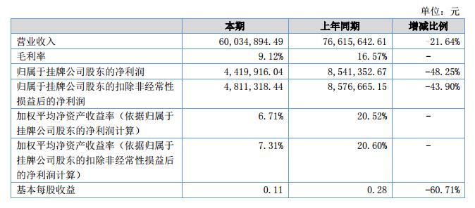 報(bào)告期內(nèi),公司共實(shí)現(xiàn)營(yíng)業(yè)收入60,034,894.49,較2017年上半年減少21.64%;毛利率為9.12%,較上期下降7.45%,較上年全年下降2%;公司2018年上半年合并凈利潤(rùn)為4,419,916.04元,與去年同期相比,下降48.25%。?