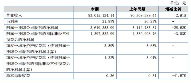 報告期內(nèi)公司實現(xiàn)營業(yè)收入93,015,124.14元,上年同期營業(yè)收入為90,309,589.44元,較上年同期增2.91%;報告期內(nèi)歸屬于掛牌公司股東的凈利潤為3,649,354.00元,上年同期歸屬于掛牌公司股東的凈利潤為5,112,785.37元,較上年同期下降28.62%。?