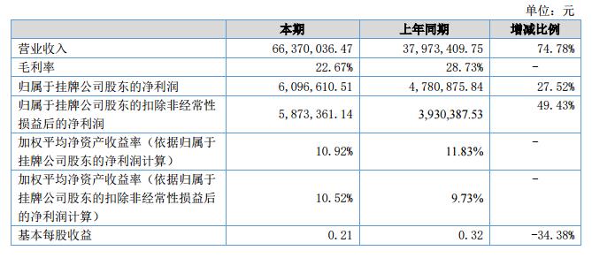報告期內(nèi),公司實現(xiàn)營業(yè)收入66,370,036.47元,較上期增加28,396,626.72元,增幅74.78%;報告期內(nèi),公司實現(xiàn)凈利潤6,096,610.51元,較上期增加1,315,734.67元,增幅27.52%。?