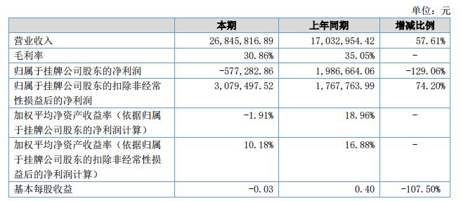 報告期公司營業(yè)收入26,845,816.89元,同比增長57.61%。本期歸屬于掛牌公司股東的凈利潤為-577,282.86元,同比下降129.06%,主要系股份支付確認管理費用所致。?