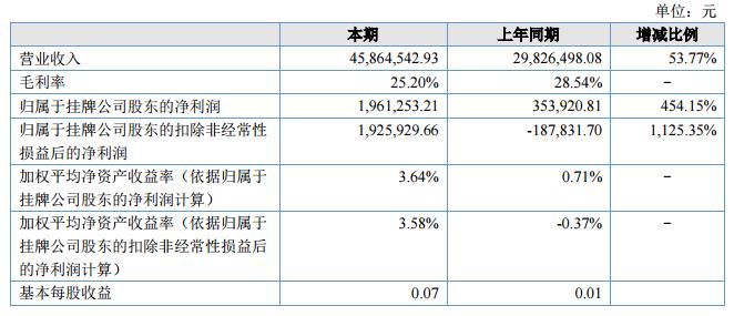 報(bào)告期內(nèi),公司實(shí)現(xiàn)主營業(yè)務(wù)收入4,586.45萬元,與去年同期相比增長53.77%;營業(yè)成本3,430.72萬元,與去年同期相比增長60.95%;實(shí)現(xiàn)歸屬于股東的凈利潤196.13萬元,與去年同期相比增長454.15%。?