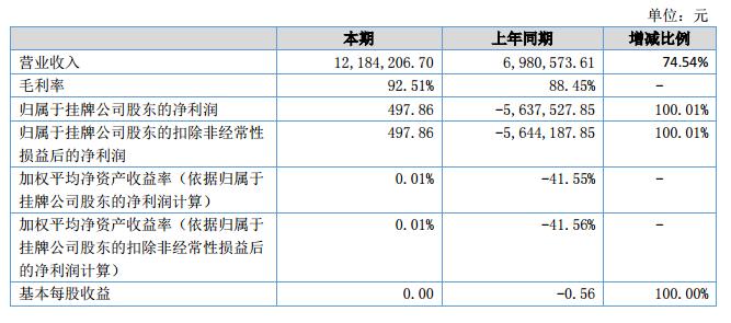 報(bào)告期內(nèi),公司實(shí)現(xiàn)營(yíng)業(yè)收入1,218.42萬(wàn)元,比上年同期增長(zhǎng)74.54%。2018年上半年,企業(yè)實(shí)現(xiàn)歸屬于掛牌公司股東的凈利潤(rùn)為0.05萬(wàn)元,比上年同期增長(zhǎng)100.01%;截至2018年6月30日,公司注冊(cè)資本1,000萬(wàn)元,資產(chǎn)總額為368.64萬(wàn)元,負(fù)債總額732.29萬(wàn)元,凈資產(chǎn)-363.65萬(wàn)元。?