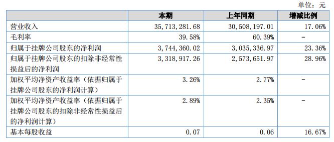 報(bào)告期內(nèi),公司實(shí)現(xiàn)營業(yè)收入3,571.33萬元,比上年同期增長了17.06%;報(bào)告期實(shí)現(xiàn)歸屬于公司普通股股東的凈利潤374.44萬元,比上年同期增長了23.36%;本期毛利率39.58%,較上年同期毛利率60.39%。?