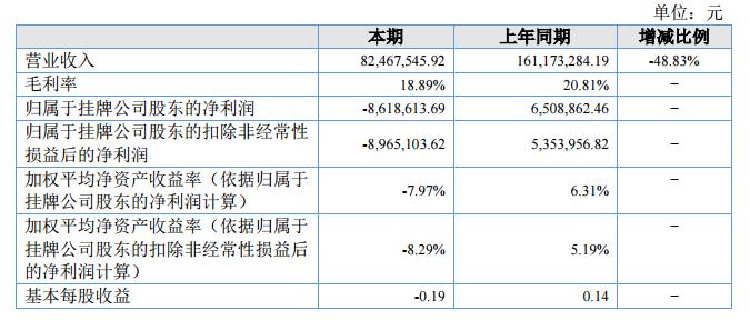 報(bào)告期內(nèi)實(shí)現(xiàn)主營(yíng)業(yè)務(wù)收入82,467,545.92元,較上年度下降48.83%;公司凈利潤(rùn)為-8,919,236.50元,實(shí)現(xiàn)歸屬于掛牌公司股東的凈利潤(rùn)為-8,618,613.69元。?