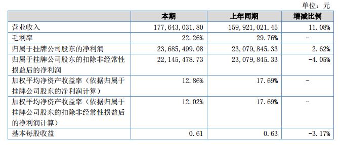 報告期內(nèi),公司實現(xiàn)營業(yè)收入17,764.30萬元,較上年同期增長11.08%;公司實現(xiàn)凈利潤2,368.55萬元,較上年同期增加2.62%。?