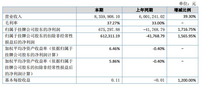 報告期內(nèi),公司實現(xiàn)營業(yè)收入8,359,908.10元,較上年同期增長39.30%。凈利潤為675,297.88元,較去年同期增長1716.75%。?