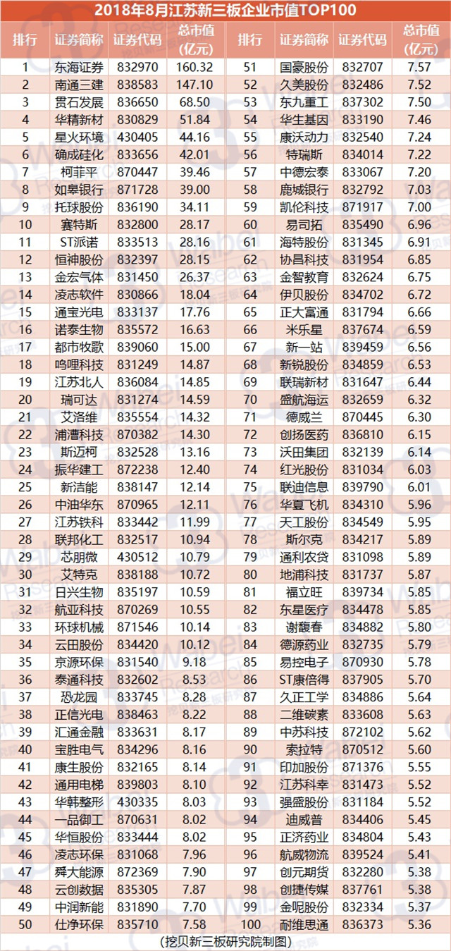 附:2018年8月江蘇新三板企業(yè)市值TOP100