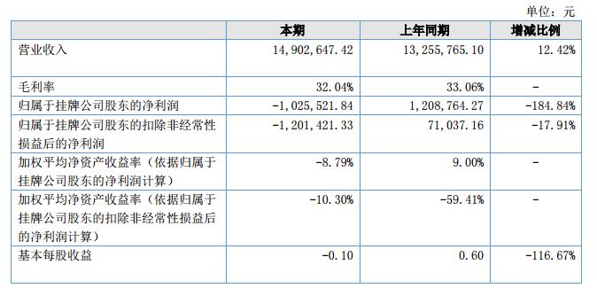 報(bào)告期內(nèi)公司實(shí)現(xiàn)營(yíng)業(yè)收入14,902,647.42元,較上年同期增長(zhǎng)12.43%;報(bào)告期內(nèi)實(shí)現(xiàn)凈利潤(rùn)-1,003,939.21元,比上年同期下降了180.74%。