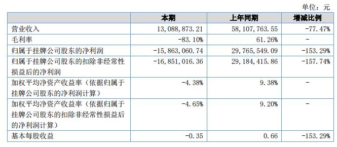 報告期內(nèi)公司實現(xiàn)主營業(yè)務收入1,308.89萬元,較上年同期減少77.47%;凈利潤-1,655.86萬元,其中歸屬于掛牌公司股東的凈利潤-1,586.31萬元,相比去年同期分別減少了156.98%與153.29%。?