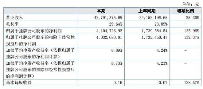 報(bào)告期內(nèi)公司營業(yè)收入為4,279.14萬元,較上年同期增長(zhǎng)25.30%;營業(yè)成本3,010.66萬元,較上年同期僅增長(zhǎng)15.82%;凈利潤(rùn)為410.47萬元,較上年同期增長(zhǎng)135.96%。