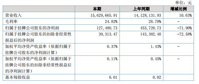 挖貝網(wǎng)9月5日,銳豐智科(證券代碼:839223)近日公布的2018年半年報(bào)顯示,截至2018年6月30日,企業(yè)實(shí)現(xiàn)營(yíng)收1562.97萬元;歸屬于掛牌公司股東的凈利潤(rùn)為12.74萬元。
