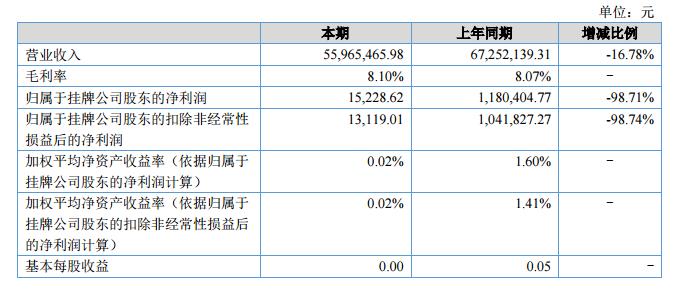報告期內(nèi)公司實現(xiàn)營業(yè)收入55,965,465.98元,較上年同期減少16.78%;公司實現(xiàn)凈利潤-331,305.08元,較上年同期減少134.58%。?
