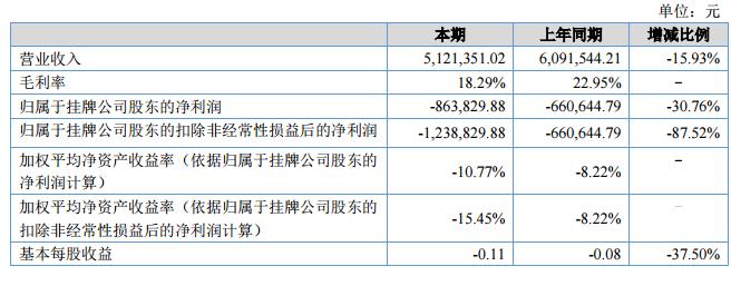 報告期內(nèi),公司實(shí)現(xiàn)營業(yè)收入512.14萬元,較上年同期減少15.93%;報告期內(nèi)歸屬于公司股東的凈利潤為-86.38萬元,比上年同期減少了20.32萬元,增減比例為-30.76%。?