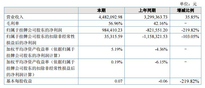 報(bào)告期內(nèi)公司實(shí)現(xiàn)營(yíng)業(yè)收入4,482,092.98元,與去年同期比增長(zhǎng)35.85%;凈利潤(rùn)984,410.23元,同比增長(zhǎng)219.82%。?