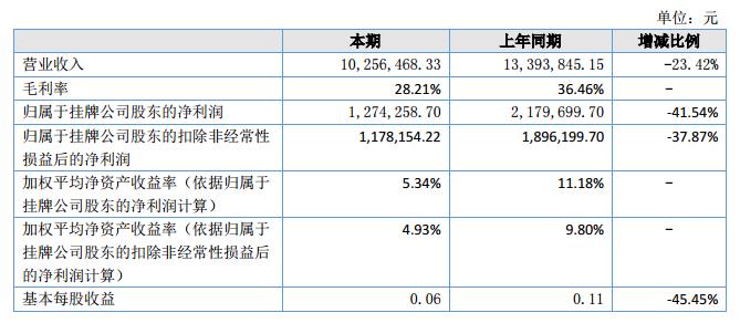 報(bào)告期內(nèi),公司實(shí)現(xiàn)營(yíng)業(yè)收入1025.65萬(wàn)元,較上年同期下降23.42%;公司實(shí)現(xiàn)凈利潤(rùn)127.43萬(wàn)元,較上年同期下降41.54%。?
