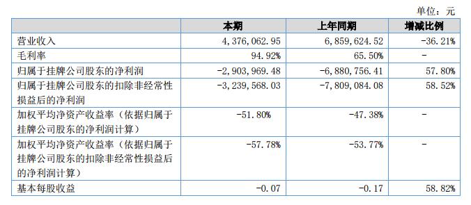 報(bào)告期內(nèi)公司實(shí)現(xiàn)營(yíng)業(yè)收入437.61萬(wàn)元,同比減少36.21%;實(shí)現(xiàn)凈利潤(rùn)-290.40萬(wàn)元,同比去年減虧57.8%。?