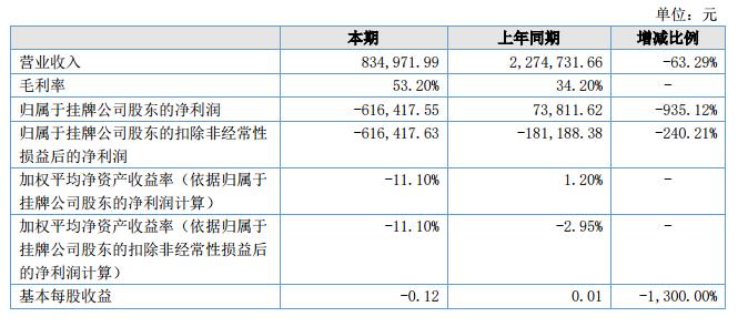 報(bào)告期內(nèi)公司實(shí)現(xiàn)營業(yè)收入834,971.99元,同比減少63.25%;營業(yè)成本390,769.14元,同比減少73.89%;凈利潤為-616,417.55元,同比減少935.12%。?