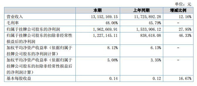報(bào)告期,公司實(shí)現(xiàn)營業(yè)收入13,152,169.15元,較上年同期增長12.16%;報(bào)告期內(nèi),公司本期毛利率為48.06%,較上年同期小幅增長;報(bào)告期內(nèi),公司凈利潤為1,962,669.91元,較上年同期增長27.95%。