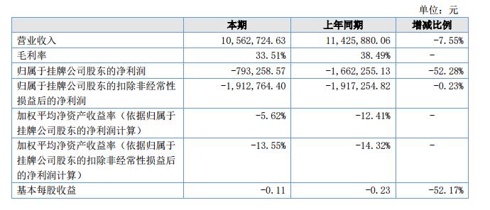 報告期內,公司實現(xiàn)營業(yè)收入10,562,724.63元,較上年同期下降7.55%,營業(yè)成本7,022,681.39元,較上期下降0.07%;凈利潤-793,258.57元,較上年同期增長52.28%。