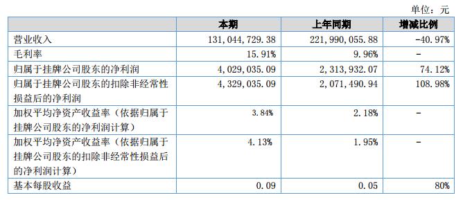 報(bào)告期內(nèi),公司實(shí)現(xiàn)營(yíng)業(yè)收入13,104.47萬(wàn)元,較上年同期的營(yíng)業(yè)收入22,199.01萬(wàn)元減少40.97%、營(yíng)業(yè)利潤(rùn)591.28萬(wàn)元較上年同期372.17萬(wàn)元增長(zhǎng)了58.87%,凈利潤(rùn)402.90萬(wàn)元較上年同期205.91萬(wàn)元增長(zhǎng)了95.67%。?