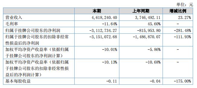 報(bào)告期實(shí)現(xiàn)營(yíng)業(yè)收入為4,618,240.40元,同比增長(zhǎng)23.27%;?凈利潤(rùn)-3,112,734.27元,同比增長(zhǎng)-281.48%。