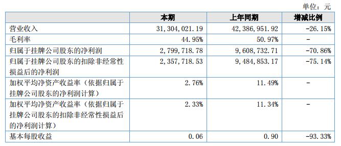 報(bào)告期內(nèi)公司實(shí)現(xiàn)營業(yè)收入31,304,021.19元,較上年同期42,386,951.92元下降26.15%;?公司實(shí)現(xiàn)凈利潤2,799,718.78元,同比增長-70.86%。