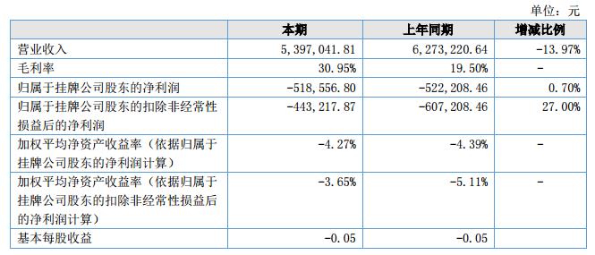報(bào)告期內(nèi)公司實(shí)現(xiàn)銷(xiāo)售收入5,397,041.81元,較上年同期下降876,178.83元,同比下降13.97%;凈利潤(rùn)-527,503.90元,較上年同期下降5,295.44元,同比下降1.01%。?