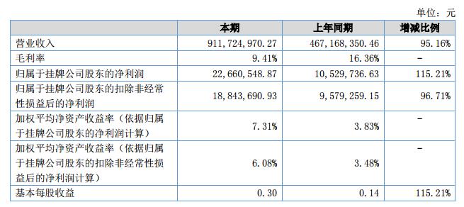 報告期內(nèi)公司營業(yè)收入較上年同比增長95.16%至91,172.50萬元;凈利潤2,266.05萬元,較上年同期1,052.97萬元增長115.21%。