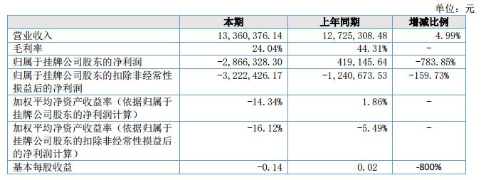 報告期內,公司實現(xiàn)營業(yè)收入13,360,376.14元,同比增長4.99%?;歸屬于掛牌公司股東的凈利潤為-2,866,328.30元,去年同期為419,145.64元。?