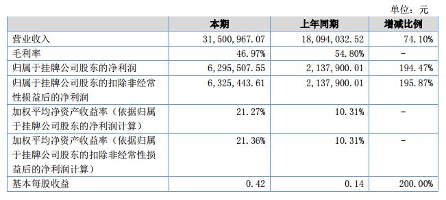 報(bào)告期內(nèi)新簽合同7000余萬(wàn)元,實(shí)現(xiàn)營(yíng)業(yè)收入3,150.10萬(wàn)元,比去年同期1809.40萬(wàn)元增長(zhǎng)了74.10%,歸屬于掛牌公司股東凈利潤(rùn)增加424.77萬(wàn)元,比去年同期增長(zhǎng)207.43%。資產(chǎn)總額增長(zhǎng)7.36%,負(fù)債總額下降20.08%,凈資產(chǎn)增長(zhǎng)23.80%。?
