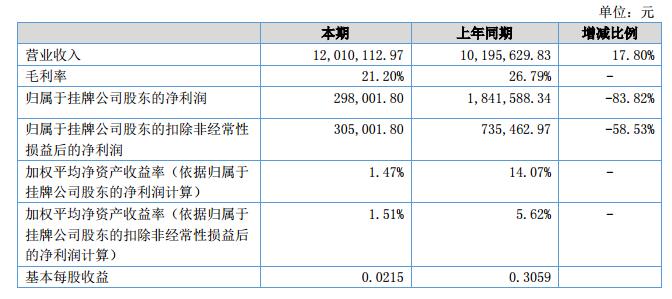 報(bào)告期內(nèi),公司實(shí)現(xiàn)營(yíng)業(yè)收入12,010,112.97元,較上年增加17.80%,主營(yíng)業(yè)務(wù)實(shí)現(xiàn)毛利率21.20%。營(yíng)業(yè)總成本11,670,810.84元,較上年同期增加24.69%,其中管理費(fèi)用1,464,098.8元,較上年同期增加19.11%,主要是管理人員薪酬的增加。報(bào)告期內(nèi),公司凈利潤(rùn)297,985.57元,較上年同期減少83.82%。?