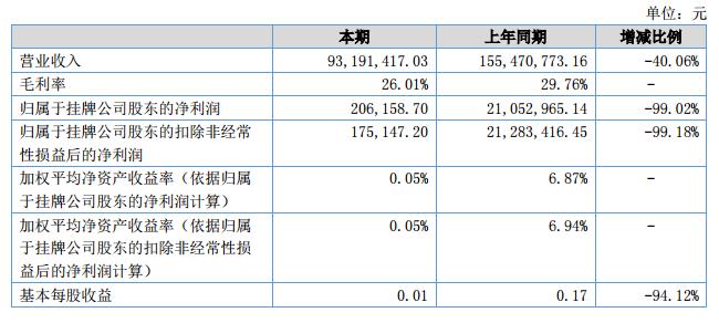 報(bào)告期公司營業(yè)收入為93,191,417.03元,較去年同期減少62,279,356.13元,減少比例為40.06%;扣除非經(jīng)常性損益后凈利潤為206,158.70元,較上年同期減少20,846,806.44元;經(jīng)營活動(dòng)產(chǎn)生的現(xiàn)金流量凈額為-40,194,006.93元,較上年同期減少114,736,709.35元,減少率為153.92%。