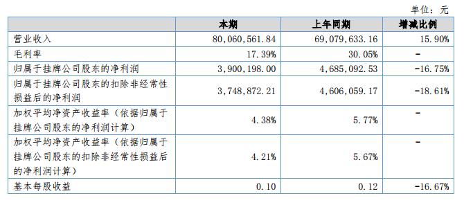 2018年度,公司實(shí)現(xiàn)營(yíng)業(yè)收入80,060,561.84元,較上年同期增長(zhǎng)15.90%;營(yíng)業(yè)成本66,137,725.04元,較上年同期增長(zhǎng)36.87%;銷售毛利率17.39%,較上年同期下降了12.66%;公司凈利潤(rùn)3,900,198.00元,較上年同期下降16.75%。?