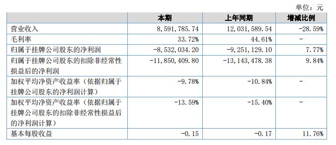 報告期內(nèi)公司營業(yè)收入859.18萬元,較上年同期減少28.59%;歸屬于母公司所有者的凈利潤-853.20萬元,較上年同期增長7.77%。