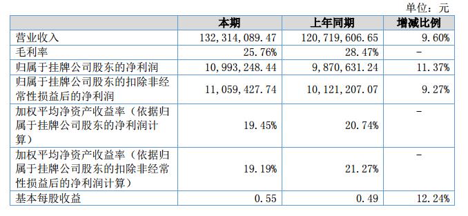 報告期內(nèi)公司實現(xiàn)營業(yè)收入132,314,089.47元;實現(xiàn)歸屬于掛牌公司股東的凈利潤10,993,248.44元,實現(xiàn)基本每股收益0.55元。?