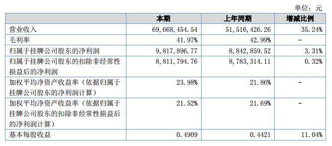 報(bào)告期內(nèi)公司實(shí)現(xiàn)營(yíng)業(yè)收入69,668,454.54元,同比增長(zhǎng)35.24%;公司凈利潤(rùn)為12,385,292.03元,同比增長(zhǎng)31.52%。?