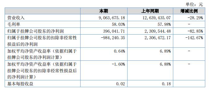 報(bào)告期內(nèi),公司實(shí)現(xiàn)營(yíng)業(yè)收入:906.37萬(wàn)元,同比減少了28.29%;公司營(yíng)業(yè)成本380.39萬(wàn)元,同比減少了28.39%;公司的凈利潤(rùn)39.60萬(wàn)元,同比下降了82.85%。?