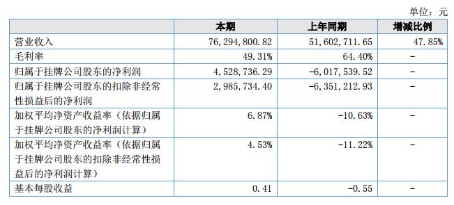 報告期內(nèi),公司實現(xiàn)營業(yè)收入76,294,800.82元,比去年同期增加了24,692,089.17元,增長了47.85%,實現(xiàn)的歸屬于掛牌公司股東的凈利潤為4,528,736.29元。