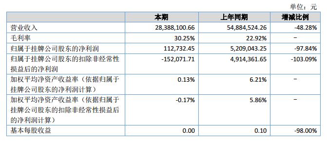報(bào)告期內(nèi),公司實(shí)現(xiàn)營(yíng)業(yè)收入2,838.81萬(wàn)元,較上年同期下降48.28%;利潤(rùn)總額為17.75萬(wàn)元,較上年同期下降97.14%;歸屬于掛牌公司股東的凈利潤(rùn)為11.27萬(wàn)元,較上年同期下降97.84%。